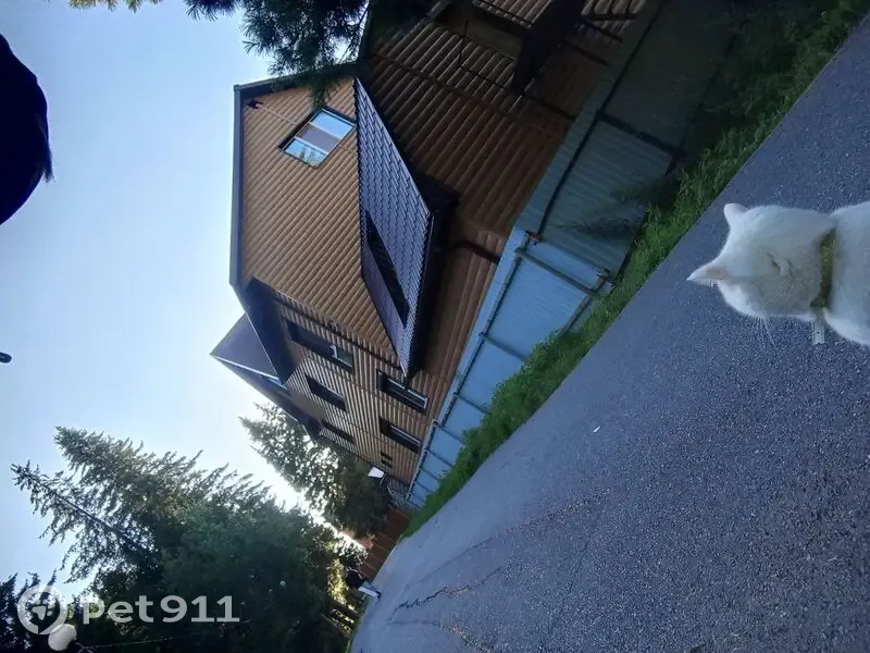 Нашел по олимпийской дороге 3км кошечку белую с желтыми глазами и зеленым в окрас ошейником по дороге у дома на фото. Очень дружелюбная надеюсь хозяин быстро найдется!!!