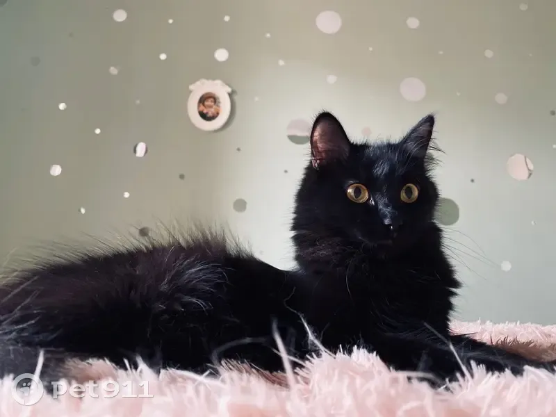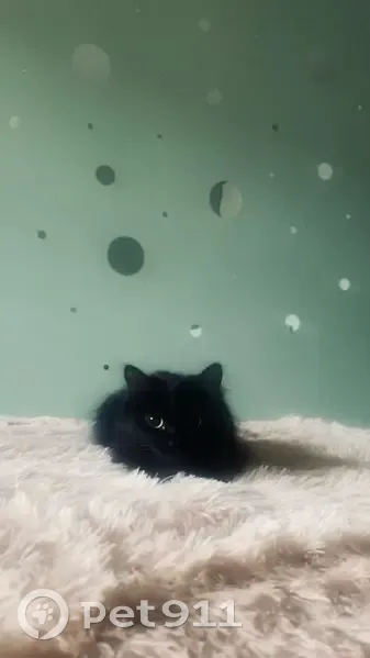 Черная, пушистая молодая кошечка с желтыми глазами. Зовут Черника. Выпала ночью с балкона 3-го этажа по улице Мира 52 А. Предположительно может обитать в близлежащих домах либо подвалах