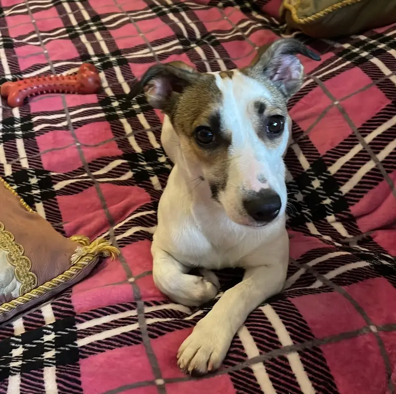 Двухцветный окрас. Белая с темными пятнами и темными горошинками на белой шерсти. Половина хвостика белая, половина темная. Девочка. Возраст от 1 года до 2-х лет. Очень ласковая.
