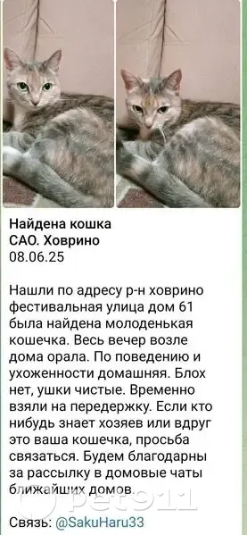 Найденные животные Москва, фото: Кошка найдена: Весенняя ул, 19, Москва