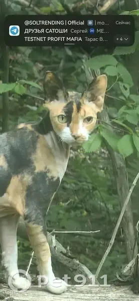 Помогите найти кошку!!Трехцветная, сфинкс велюровый. На левом глазике не сокращается зрачок поэтому кажутся разные глазки. Кличка Лора.Мы живем на первом этаже и она спрыгивает и гуляет по территории внутри поселка. Поселок закрытого типа, ее тут все знают, но у нас в посёлке есть спортивный комплекс и возможно ее кто-то забрал подумав что потерялась.Очень осторожная и умная кошка, не очень дается в руки, может шипеть. Утром в 10 . 00 пошла на улицу и не вернулась, за три года такое впервые, свои в поселке знают ее, у нас тут все коты гуляют. Может у кого будет информация о кошке, пожалуйста помогите найти за вознаграждение
