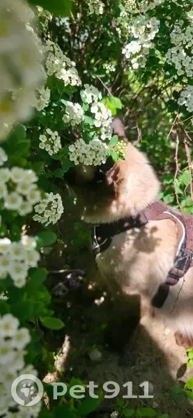 Шерсть темно-коричневая на голове, лапах и хвосте. Остальной цвет тела светло-коричневого окраса. Сиамской породы. Был в коричневой шлейке. Вечером примерно 23:00-23:30 гуляя со мной и собакой ушёл в направлении дома 14к2 по улице Германа Титова.