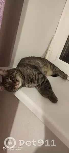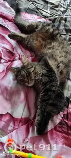 Шерсть коричнево-серого цвета с черными полосками и пятнами по всему телу, а животик и грудка светло-коричневого цвета. Глаза янтарные. Пугливая,с чужими людьми не любит контактировать. Без ошейника.