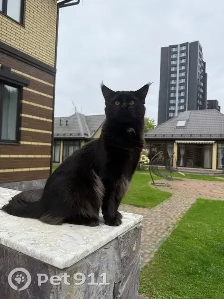Кот, кастрирован, чипирован. Порода Мейн Кун. Большой, весит около 7-8кг. Окрас черный, при свете - темный шоколад. На животе местами серый. Убежал с участка.