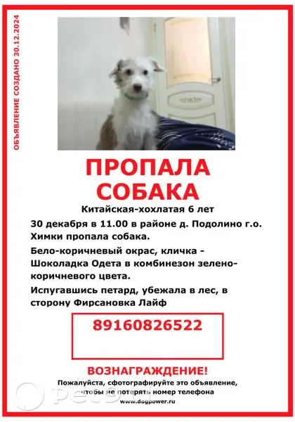 Объединено с объявлением rl944068. Причина-дублирование информации. Описание дублирующего объявления: 30 декабря в 11.00 пропала собака китайская-хохлатая, кличка - Шоколадка, в районе д.Подолино. Испугавшись петард, убежала в лес в сторону Фирсановка Лайф. Одета в зелено-коричневый комбинезон