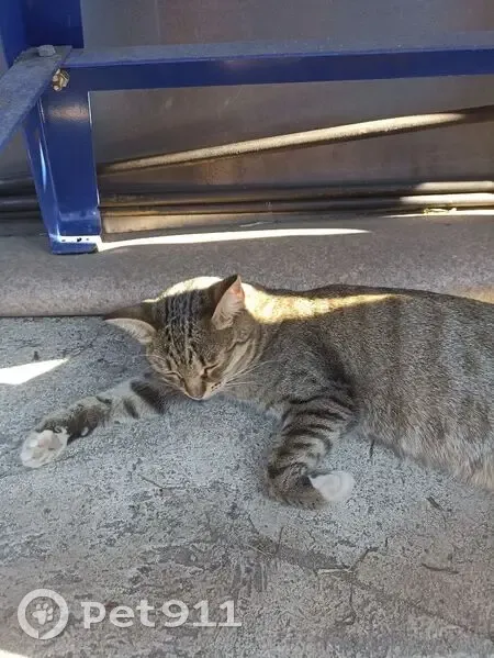 Пестрая, серая с рыжиной, полосатая, на лапках белые носочки. Кошка ласковая, спокойная, идёт к людям, явно жила дома. Молодая, совсем недавно родила котят, худая. Шерстка чистая и хорошая.