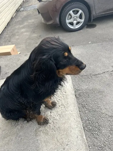Порода такса, окрас черный, лапки рыжие. Возраст 1.5 гола. Вес 10 кг. Шерсть на ушах кудрявая.