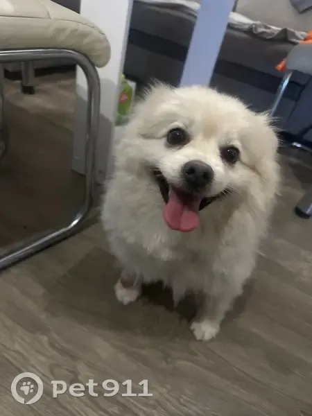 Шпиц белого цвета, на лапке рана. Очень добрый, пошел за нами, так как на улице зима взяли на временную передержку, долго держать не можем, у самих собака.