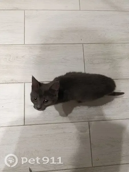 Пепельного цвета. С небольшим "галстучком" на грудке белого цвета. Сидела под дровницей и громко мяукала. Смогли выманить не сразу, но как только она вышла начала ласкаться.