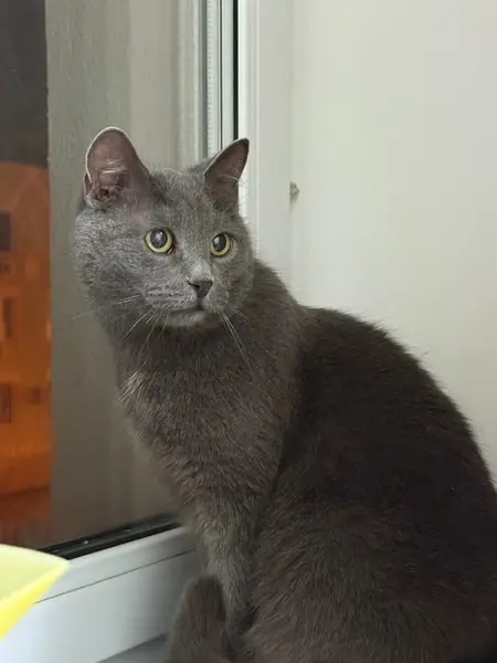 Серого окраса, домашний, очень боится окружающих и шума. Длинный. Прыгнул рано утром со второго этажа за птичками.