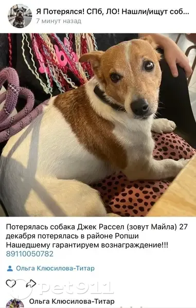 Новая Ропша Потерялась наша Майлочка((( Белая с рыжими пятнами, Джек Рассел, девочка, убежала 27 декабря и не вернулась, очень переживаем…Кто знает где она может быть, позвоните пожалуйста 89110050782 Вознаграждение!!!