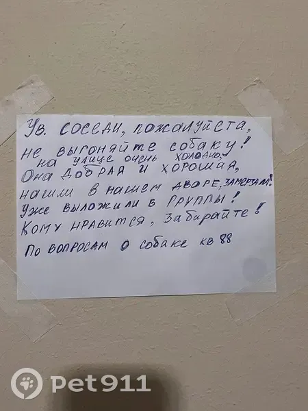 Была найдена собака по адресу Ульяновская 21/1 Без ошейника, есть поводок (вокруг шеи, петлей) пол неизвестен. Черные глаза, чуть белая грудка. В данный момент находится ул.Ульяновская 21/1, 3 подъезд. Между первым и вторым этажом.