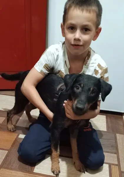 Кобель, лет 8-9 , черно- коричневый, бегал по трассе Слободской - Киров возле поселка Вахруши 05.04.23 года в районе 11-12 часов дня. Его подобрал водитель легковой машины, привез в Слободской, приютил на передержку