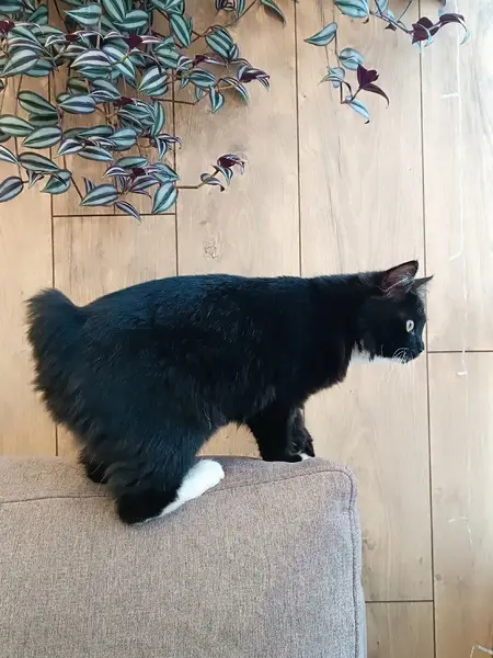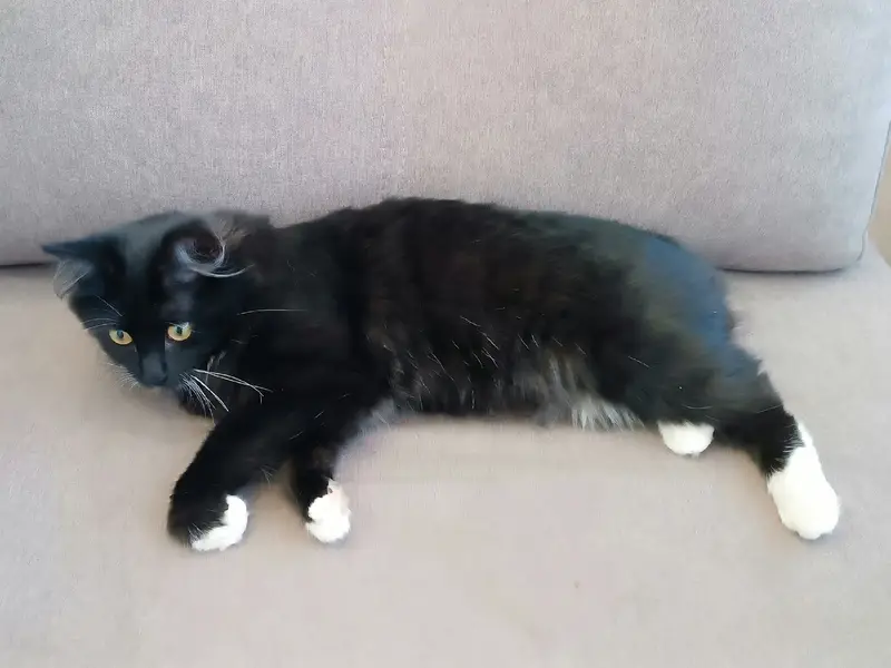 Кошка, 6 лет, черно-белая, белые усы и брови, от подбородка по животу белая полоса. Кличка Пулька. Стерилизована, привита. Могли забрать. Кошка контактная, пушистая, хвост пушистый.