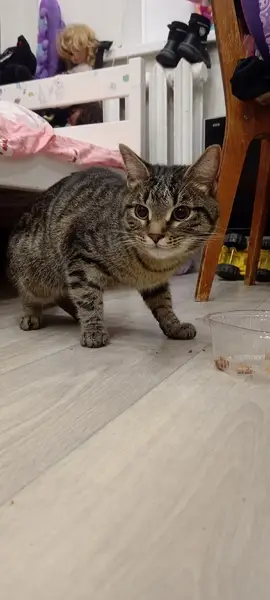 Пол мужской. Окрас серый с полоску, не кастрирован, глаза зеленые, очень ласковый и тактильный, но пугливый. Кот самостоятельно гуляет, но всегда возвращался домой и далеко не уходил.