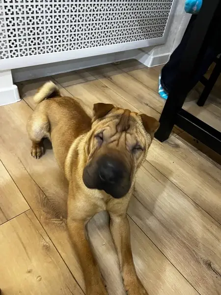 Шарпей, 4 года, шлейка фиолетового цвета, красный светящийся ошейник