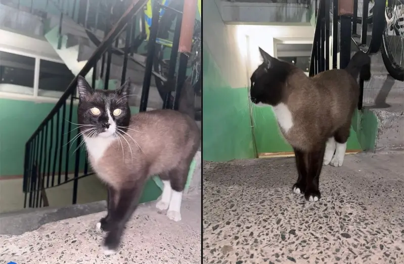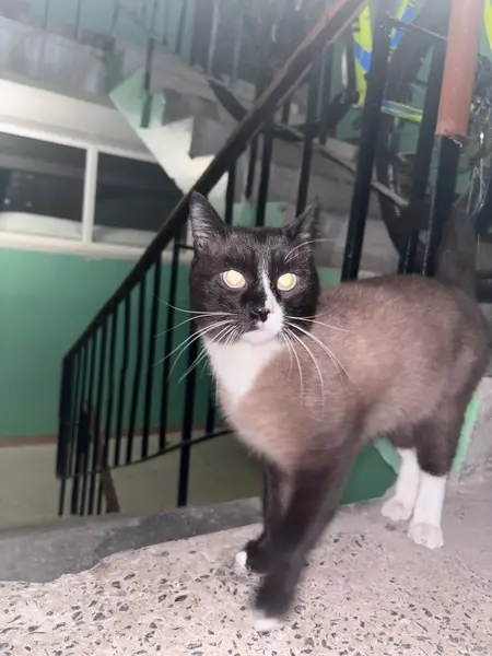 Кот, похож на сиамского, передние лапы белые, задние черные, голубые глаза, черно-белый нос, нашли в подъезде на лестничной клетке.