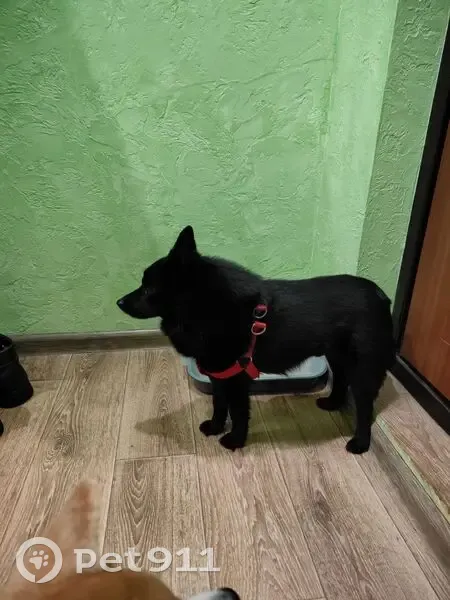 Кобель черного цвета в красной шлейке. Без хвостика. Похож на шкиперке.