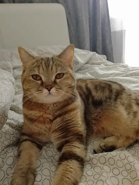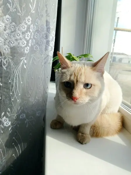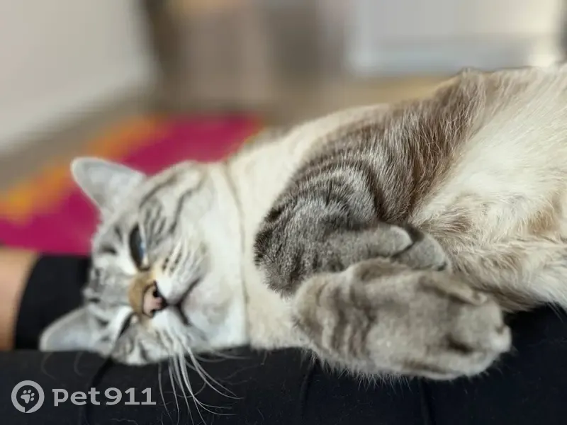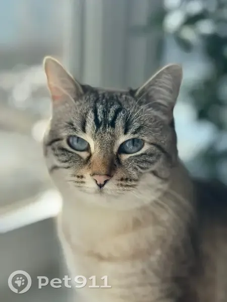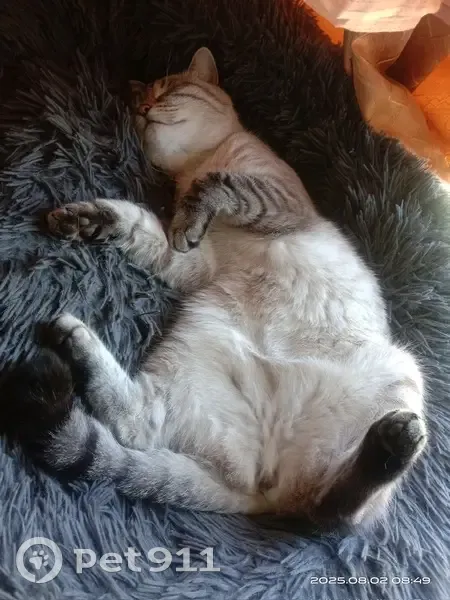 полосатая, среднешерстная, бежево-кофейного цвета, тайский окрас, на лбу рисунок в виде буквы М, нос розовый с черной окантовкой, глаза серо-голубые, 3,5 кг, 5 лет, стерилизованная.