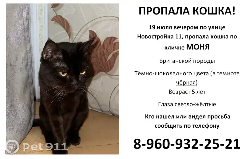19 июля вечером по улице Новостройка 11, пропала кошка по кличке Моня. Британской породы; тёмно-шоколадного цвет (в темноте чёрная); возраст 5 лет; глаза светло-желтые. Кошка не мяукает, ребенок очень переживает, помогите найти!