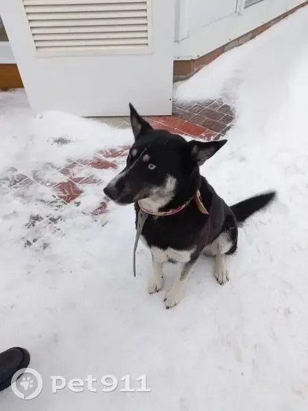Черная собака с белыми лапами, разные глаза (коричневый и голубой). На шее два ошейника один с красным платком, второй серый с ремешком тканевым плотным длинее шеи. Чистая, добрая. Знает простые команды "сидеть", "ко мне". Сегодня днем была возле магазина Крюгер в северном парке. Ест еду из рук, машет хвостом, лижет руки. Возможно сбежала из Тимирязево или близлежащих деревень.