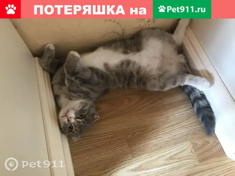 Вислоухий котёнок, мальчик. Без ошейника(был снят...) Окрас серый, с белым брюшком и носочками, так же темно-серые полоски и пятна как у леопарда. Белые носки на передних лапах короткие, а на задних - длинные. Носик розовый, но с родимым пятном серого цвета. Глаза желтые, подушечки лап цветные. Мальчику всего лишь год, откликается на «пузырек» и «исико». Кот на улице не выживет, не умеет постоять за себя, боится машин, котов и всего шумного. Вышел из открытого ночью окна. Потерялся в округе Гор-сети и «химки» стадиона, в частном секторе. Если увидете, пожалуста, напишите. За вознаграждение Если кто-то забрал к себе, прошу, верните, котик родился и вырос у нас, вместе с его отцом, он нам как родной