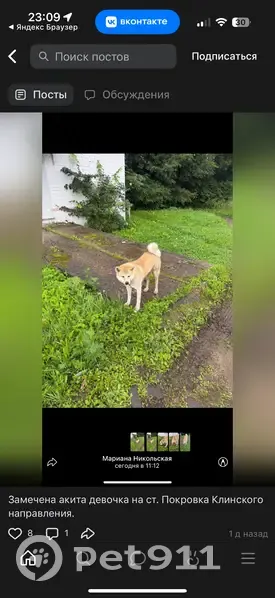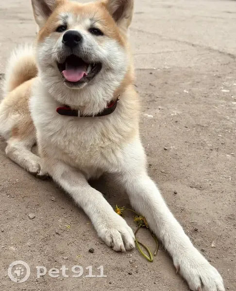 Порода Акита Ину. Окрас бело-рыжий. На животе и лапках есть черные пятнышки. Ошейник черно-красный. Собака добрая. В одной из групп нашла пост, что 12 августа видели на ст Покровка Клинского направления (3 фото)