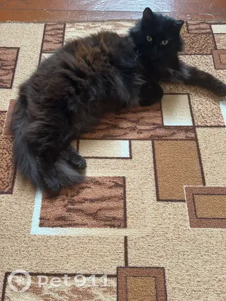 Зовут Валера, кот домашний с черным ошейником. Сам кот черный, с янтарно-зеленными глазами, левое ушко заломано, хвост кисточкой и немного без шерсти из-за линьки