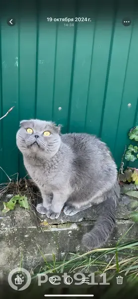 Шотландский вислоухий, не кастрирован, цвет серый, особые приметы, левое ухо загнуто наружу, без ошейника. Ушел через дырку в заборе к соседям и далее.