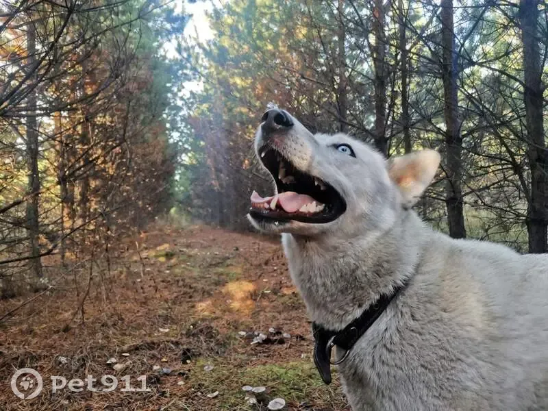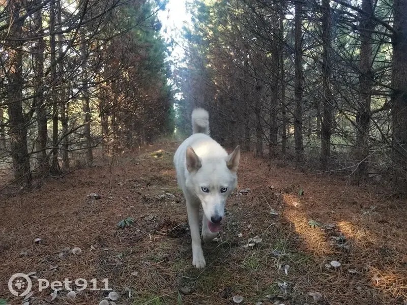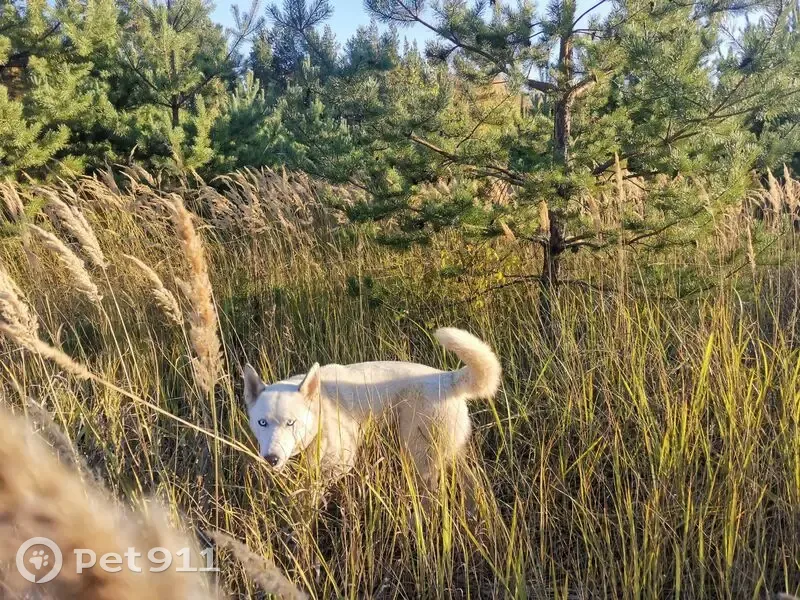 Помесь хаски и лайки. Белая шерсть, голубые глаза, хвост обычно поднятый. Чёрный ошейник. Приветливая, даёт себя погладить незнакомцам. Убежала после проблемных родов. Возможно, сзади заметны послеродовые выделения. Из-за этого может быть в окружении стаи псов. Нуждается в лечении.