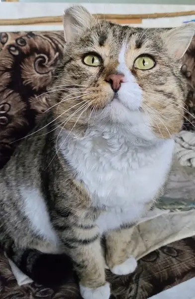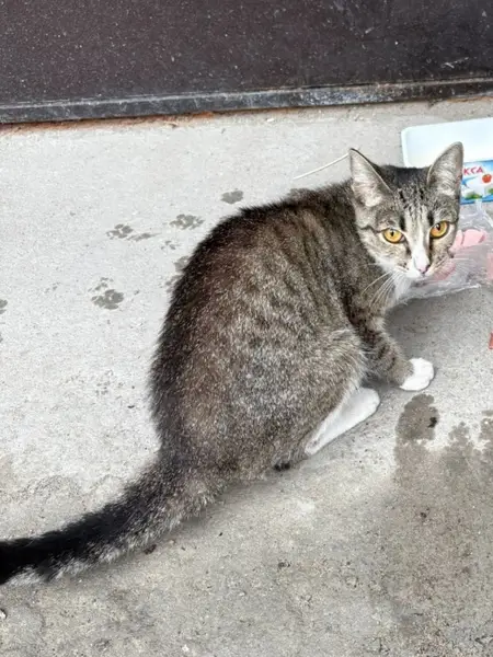 Кошка помесь бобтейла (крыселов), на вид не больше года. Самка. Ластится, видно, что домашняя, лезет на руки. Вероятно принесли дети, возможно с района 13 школы (но не точно, по словам соседей)