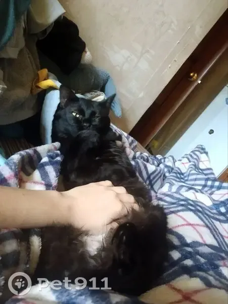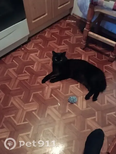Чёрный пушистый кот. С белым пухом на грудке и белой шерстью на пузе. Глаза жёлтые. Пугливый, испытывая страх, закручивает хвост в "спиралькой" вниз. Голос хрипловатый. Носил зелёный ошейник от блох, кастрирован. Коту 2 года. Как пропал: Вышел погулять в огород, и так и не не вернулся.