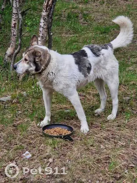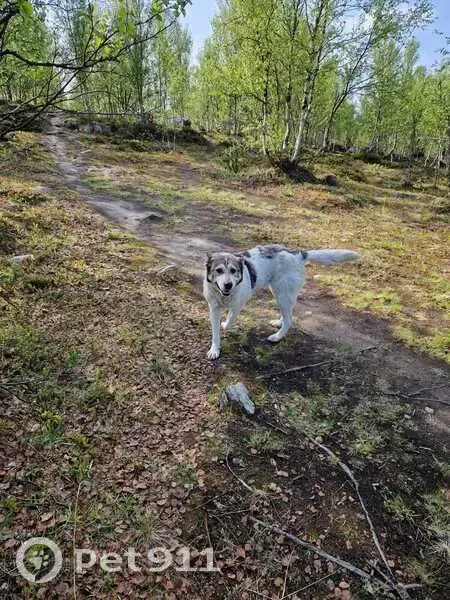 Белая собака с черными пятнами , примерно на 14-16 км Серебрянкой дороги слева недалеко от озера ,живет на стоянке и встречает каждую машину заезающую в лес и ждет когда вернется за ней хозяин , на собаке ошейник но на нем нет никакой информации
