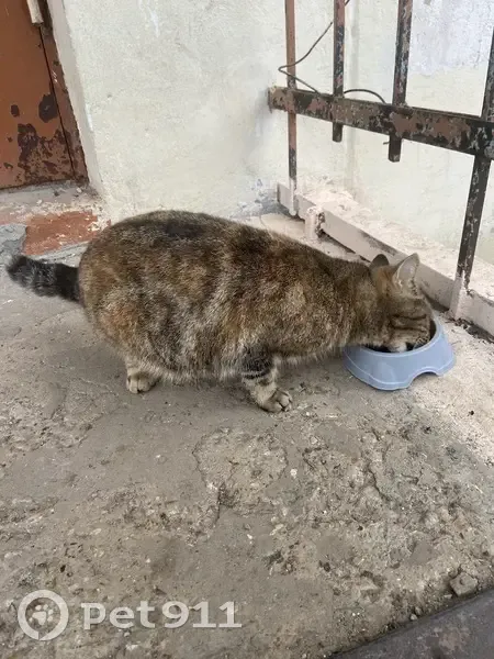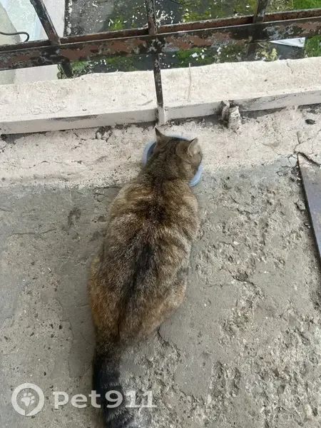 Разноцветная кошка, хвост на ощупь весь переломанный, упитанная. Возможно стерилизованная, так как за этот период беременной не была, с другими местными котами не контактирует, пугается и убегает.
