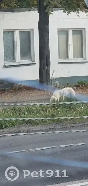 По дороге бродит ,белый, видно старенький Алабай, спокойный, плохо слышет, не подходит.. По баивается. Видно у кого-то оторвался... Идёт по направлению к Луховицам... Опасно по обочине, по середине дороги. На шее обрывки синей верёвки. Вдруг хозяин ищет.. На остановке..