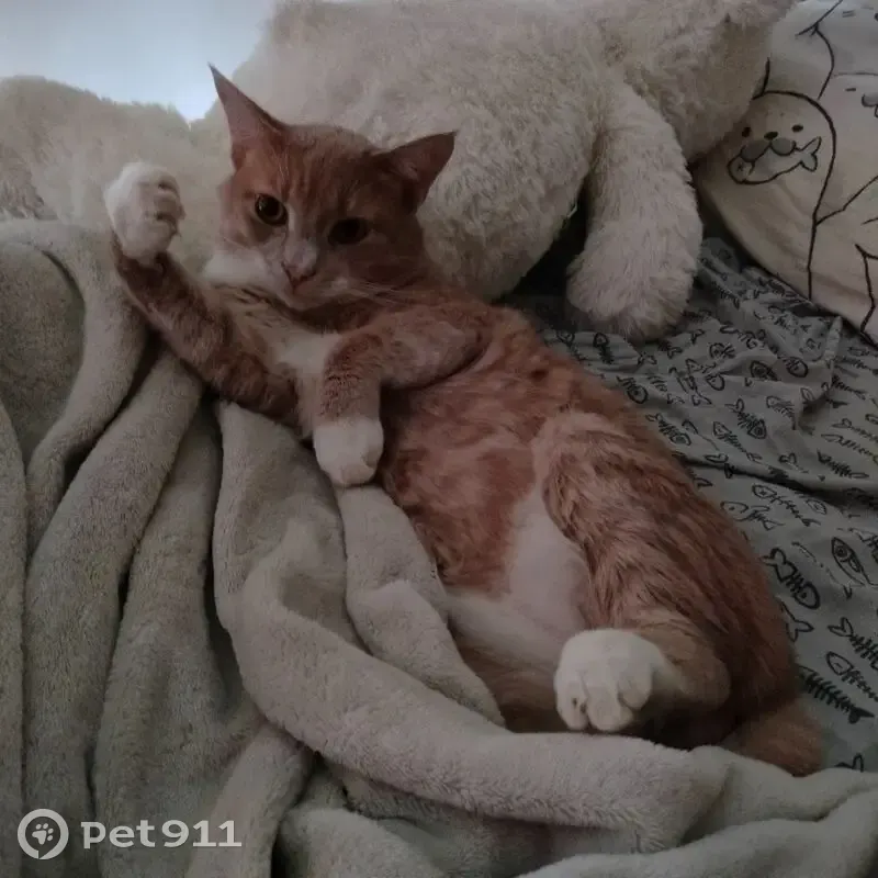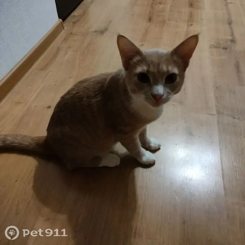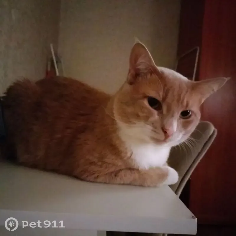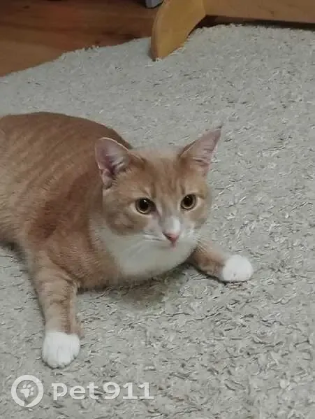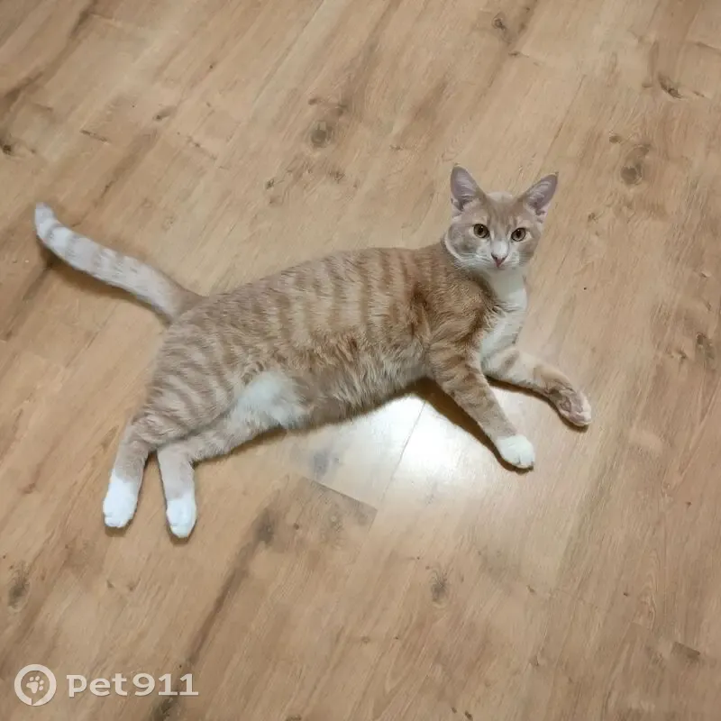Цвет бежево - рыжеватый, на груди немного белый воротник и лапки белые как носочки, ласковый домашний котик, спокойный, не агрессивный. Выпрыгнул с балкона первого этажа.