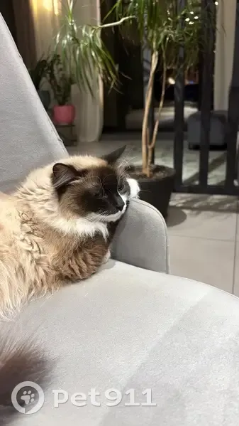 Белая, пушистая, с коричневыми лапками, ушками и мордочкой, но отличительная особенность: половина мордочки не закрашена в коричневый, очень ласковая, контактная с людьми, даже не боится собак.