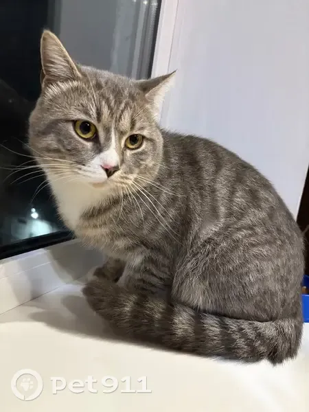 Серо-белый кот, желтый цвет глаз, ласковый, с...
