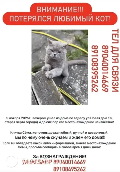 5 ноября 2025г Убежал на улицу черта старого города, ул Новая дом 17 и больше не вернулся. Кличка Сёма. Ласковый и ручной. Если вдруг знаете его местонахождение сообщите пожалуйста, 89040014669 89108395262 Мы очень скучаем и ждем его дома! Вознаграждение гарантируем!