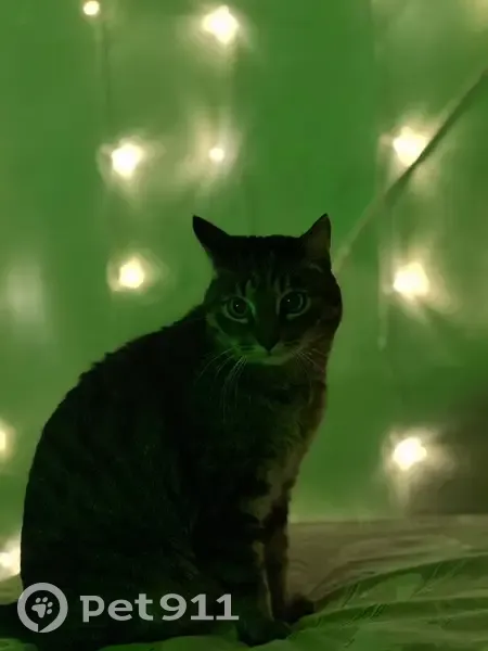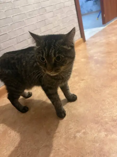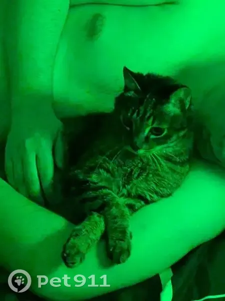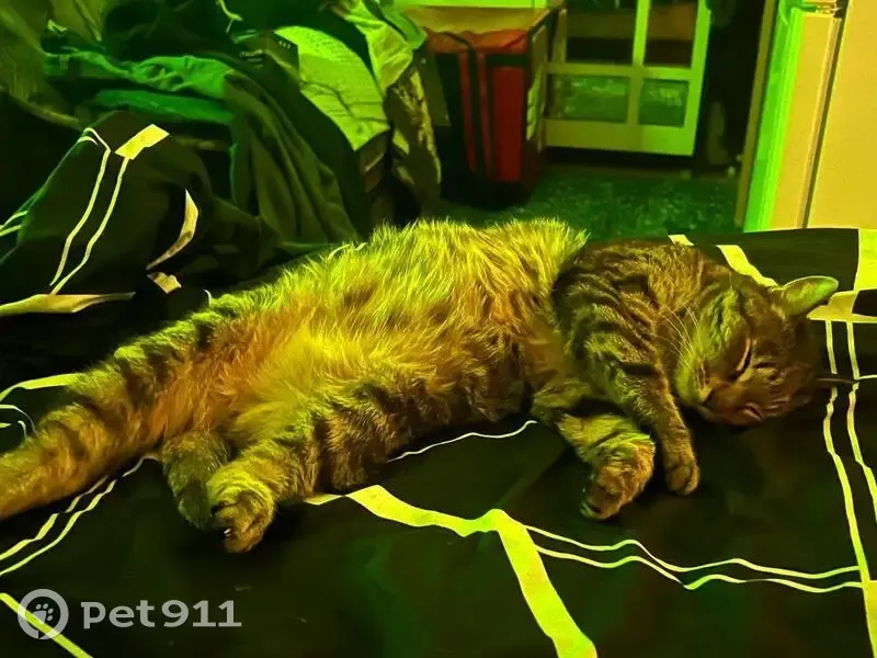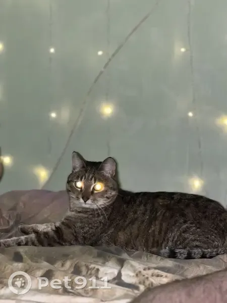 У кота полосатый (табби) окрас: на светлом, серовато-бежевом фоне идут чёткие тёмные полосы, которые особенно заметны на лапах и хвосте. На мордочке выделяются тёмные линии по бокам от глаз и на лбу Кот сорвался из рук, когда мы эвакуировались из горящего подъезда. Убежал в район подвалов проспекта славы 23В