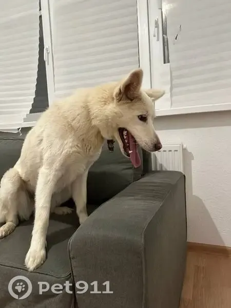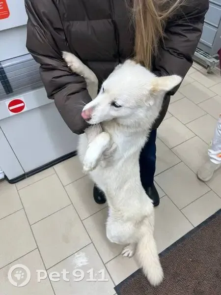 Найдена собака у магазина магнит в Коптяках (Среднеуральск). Окрас белый, девочка. Была в ошейнике, видно, что собака домашняя, возможно, сорвалась с цепи.