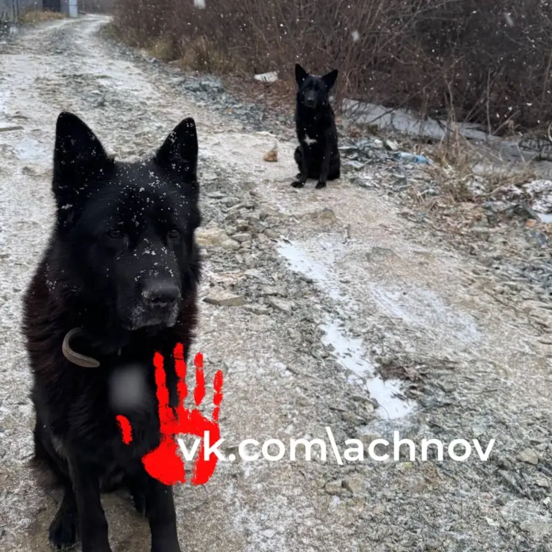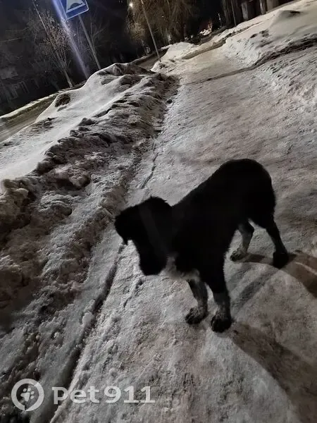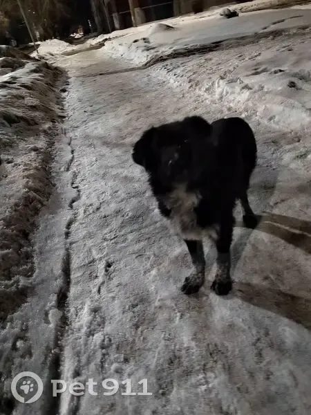 Размер средний, черный, с серыми лапками, шерсть немного кудрявая, гладкая, мягкая. Ушки висят. Глаза умные. Похож на метиса русского спаниеля. Сильно истощен. Добрый, ласковый.