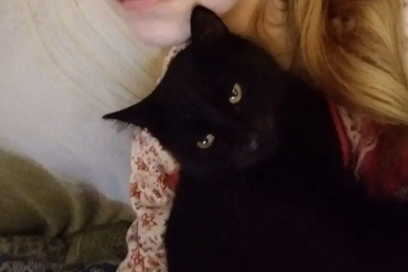 На улице найден кот 4 мес. Домашний, черный гладкошерстный, оранжевые глаза, странное выражение мордочки.