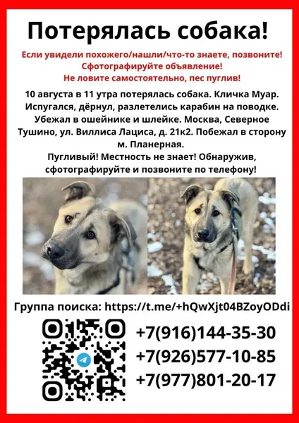 Срочно! Г. Королёв. 29.07.2025 бегала около станции Подлипки Дачные со стороны ул. Грабина. Явно потерялась, искала хозяина во всех, кто проходил мимо. Позже выяснилось, что хозяин художник, он умер, а её просто выкинули. Жила в районе Юбилейный. Очень исхудала, явно больше недели ничего не ела. Боится громких звуков, но очень спокойная и тянется к людям. Окрас бежевый с черным, белый кончик хвоста, метис. Сделан паспорт, прививки и обработка от паразитов, здорова. Ищем нового хозяина и дом! У себя нет возможности оставить. Миски, корм и новую игрушку дадим с собой.