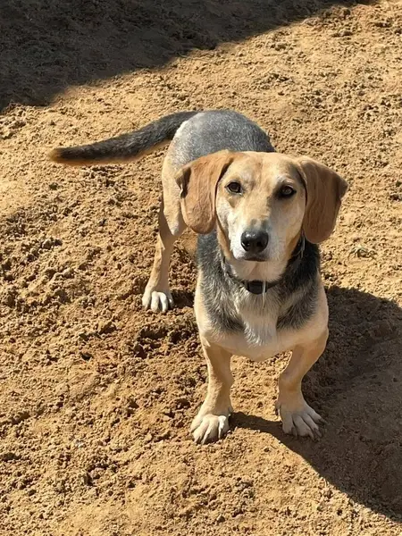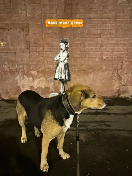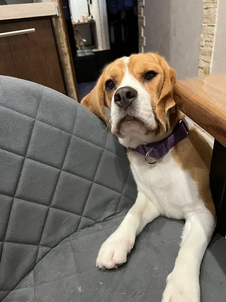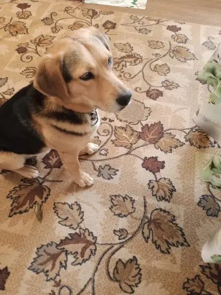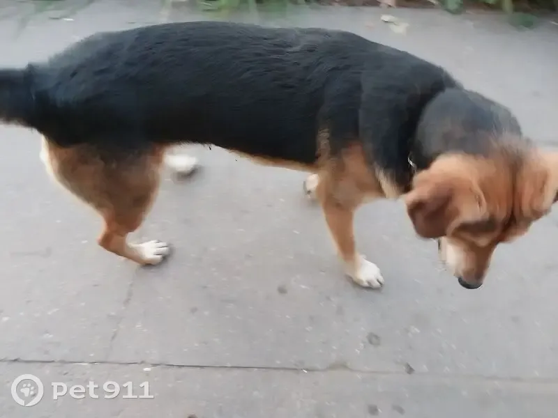 Спокойная, с коричневым тонким ошейником, много дырочек, металлом окаймленных, на ошейнике датчик звуко-световой
