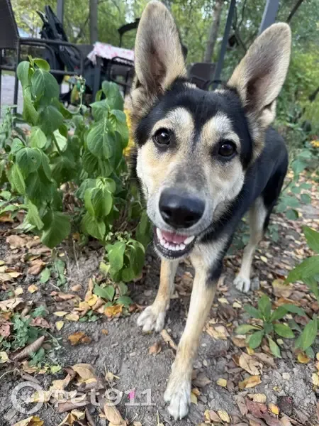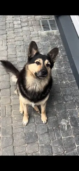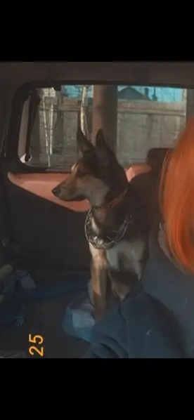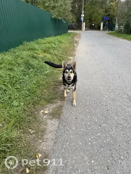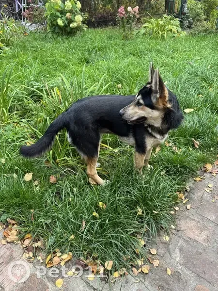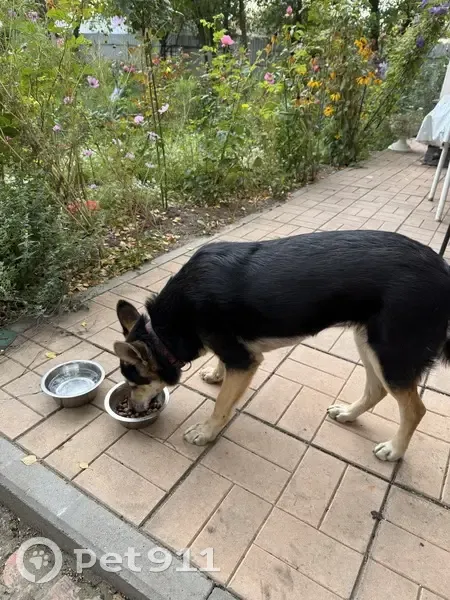 девочка, темный окрас, молодая, с ошейником с красными собачими лапами, ухожена