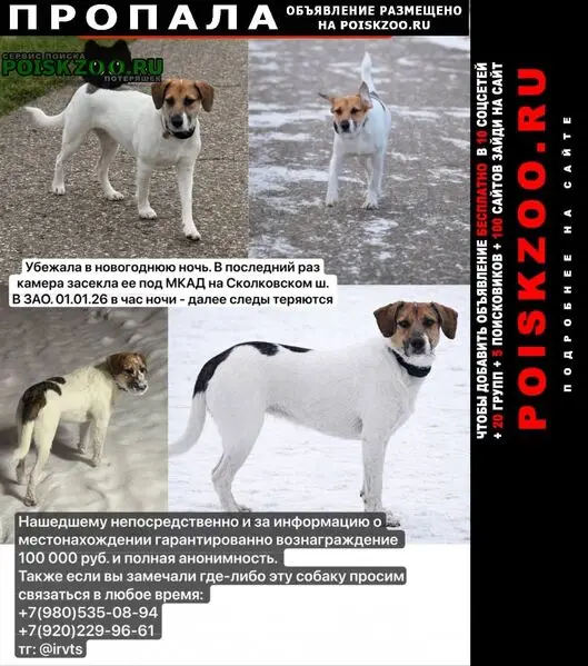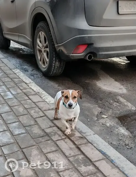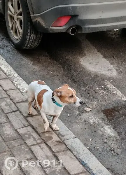 Джек- рассел терьер, голубой или бирюзовый ошейник, в руки не даётся, рыжие пятна на голове и туловище.