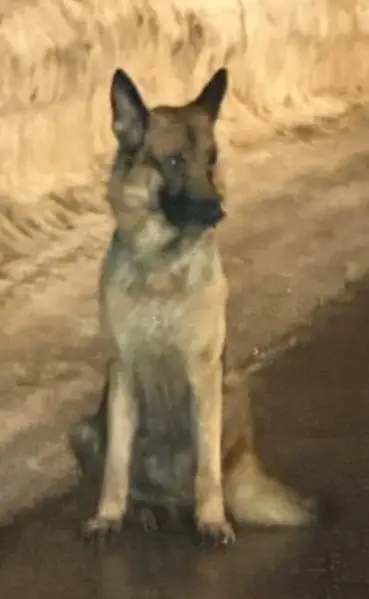 Собака мальчик, кличка Грей, чуть выше колена, похож на овчарку. На нем жёлтая шлейка,с адрисником.не кусается