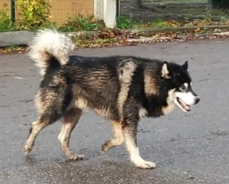 Окрас серо-чёрно-белый. Глаза голубые. Ошейник тканевый чёрный. Добрый по характеру. Погнался за дикими животными в сторону СНТ Хлыново( Москва, Троицкий район, рядом с Подольском)и мы его не смогли догнать. Убежал с поводком-рулеткой. Ну а дальше, видимо, заблудился, иначе бы вернулся. Всегда возвращался. Очень любит свой дом.