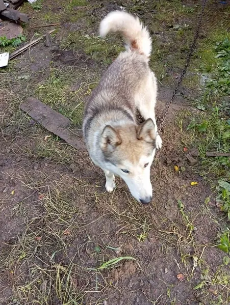 Потеряшка!!! Собака, похожа на лайку. Хорошая, чистая... Бегает у остановки на конечной Мотордеталь. Временно пустили погреться в ларек (хлеб, булочки, пирожки).Кто ищет,там спросите.